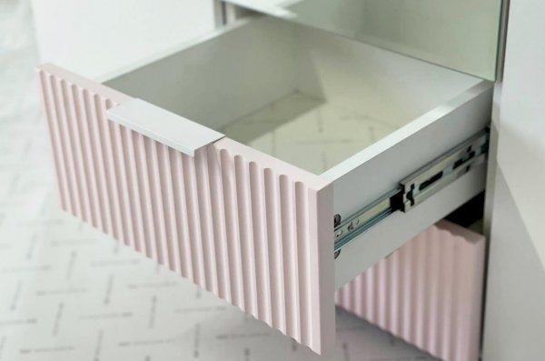 Габариты 1200х422х1900 мм обеспечат достаточное пространство для хранения одежды, белья и других предметов, а благородное белое дерево и розовая пудровая эмаль придают шкафу шарм и изысканность. Фасады из МДФ с фрезеровкой в виде вертикальных полос создают интересный и стильный акцент.