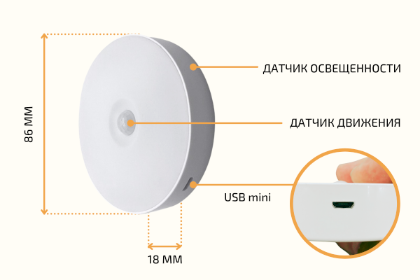 Светильник предназначен для беспроводного умного освещения. Датчики движения включаются только в темноте, когда объект находится в диапазоне 3 м и автоматически выключается через 15-20 секунд, когда объект выходит из заданного диапазона. Зарядка осуществляется через USB-порт. Зарядное устройство можно подключить к компьютеру или мобильному телефону.