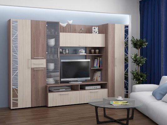 Компактная и функциональная стенка Дарина позволяет разместить множество предметов и защитить их от пыли, а также создать приятное настроение в комнате. Эта модель не только украсит гостиную, но и позволит аккуратно разложить и расставить десятки вещей. Такая стенка оригинально оживит интерьер, послужит отличным местом для хранения вещей, витриной для книг и комнатных украшений, и конечно, своё достойное место на ней найдёт телевизор – он станет главным визуальным акцентом композиции. Симметричный дизайн и сочетание контрастных оттенков цвета понравятся приверженцам классических линий, изготовленная из ЛДСП, она легко впишется практически в любую обстановку. Конструкция стенки сочетает в себе открытые ниши, вместительный выдвижной ящик, а также полочки за стеклянными и глухими дверцами.