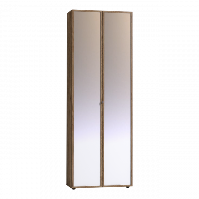 Двухдверный распашной шкаф легко открывается за ручку-петлю из микрофибры, которая устанавливается на одном зеркальном фасаде, другой - открывается за рамку. Шкаф комплектуется выдвижной штангой и двумя нишами сверху и снизу. Корпус шкафа выполнен в декоре Дуб Табачный. Регулируемые опоры компенсируют неровности пола.