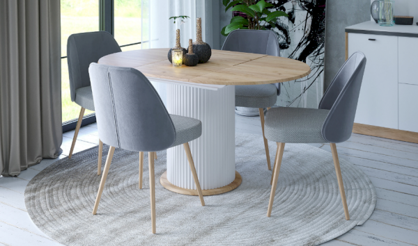 Раздвижной стол-трансформер поможет Вам сэкономить пространство в помещении, занимая в сложенном состоянии минимальное количество места. В сложенном виде обеденный стол вмещает 4 персоны, в разложенном виде он превращается в большой обеденный стол на 6 человек.