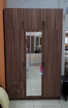 Очень вместительная модель трехстворчатого шкафа с ящиками будет прекрасно смотреться в вашей спальне. Изделие состоит из нескольких зон для хранения одежды и обуви, включая два выдвижных ящика для мелких вещей, отделение для одежды на вешалках и вместительные полки. В центральную створку вставлено зеркало, что помимо основной функции, позволяет визуально расширить пространство. Сочетание тёмного корпуса и светлых фасадов позволит шкафу стать частью практически любого интерьера.